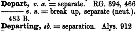 Why would any of the early Middle English translations use departing? Doesn't that mean a spatial departure? Had House done his research, and consulted a Middle English dictionary, he would have learned that the Middle English meaning for "depart" and "departynge," is "division,"18 "break up" or "separation."19